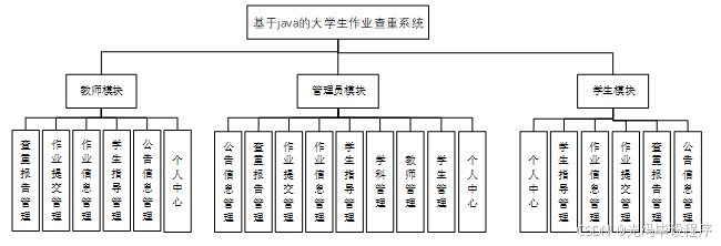 功能需求分析是系统设计的前提,它要求开发者和用户定义开发什么样的体系和系统需要什么样的功能。本文主要介绍了大学生作业查重系统。该系统为用户提供了更安全、更高效、更便捷的服务途径。本系统有三个角色:管理员、学生和教师,要求具备以下功能:
