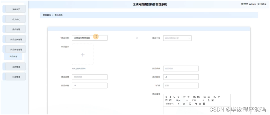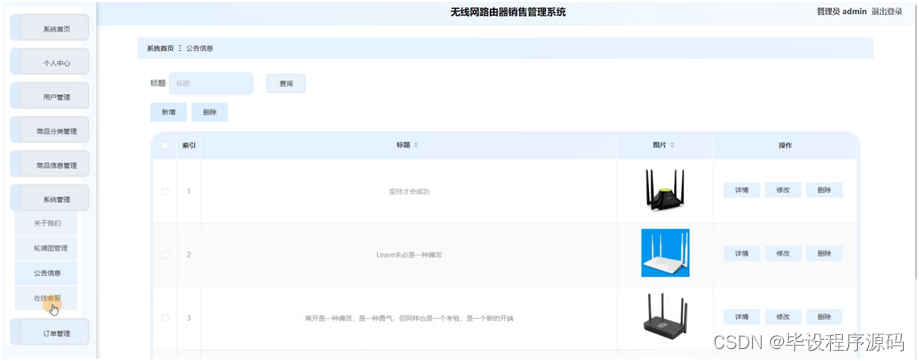 本文围绕无线网路由器销售管理系统展开,介绍了项目运行环境和技术,包括Jdk、Tomcat、Mysql等。进行了功能需求和系统流程分析,设计了功能模块和数据库,还阐述了系统前台和后台管理员模块的实现,提供毕设帮助、源码分享与调试部署。