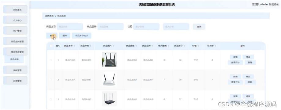 管理员点击商品信息管理,进入商品信息管理页面,通过输入商品名称、商品品牌、价格可以进行查询的操作,还能对商品信息进行新增、修改、查看评论或删除等操作。具体操作如下图所示: