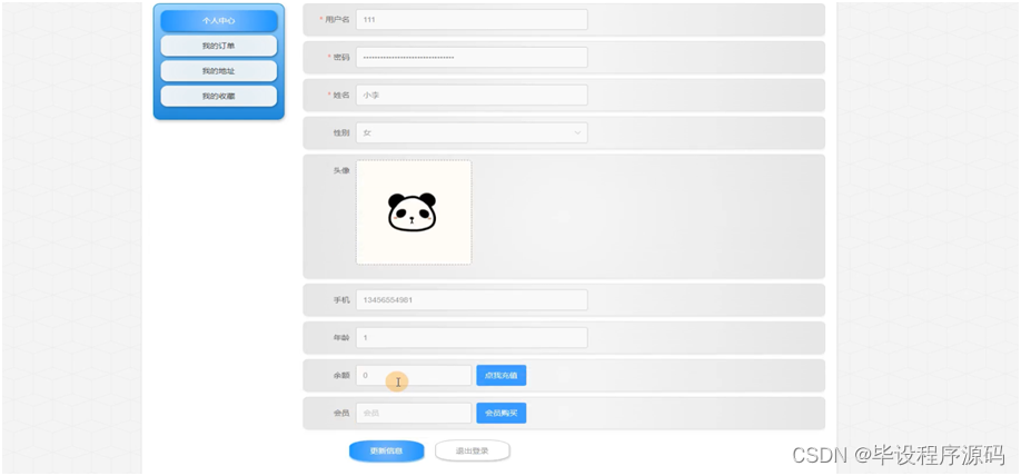 点击个人中心,用户在个人中心页面可以更新个人信息、充值余额、购买会员,还可以对我的订单、我的地址和我的收藏内容进行详细操作;具体操作页面如下图所示: