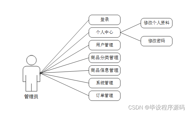 (2)、管理员的功能是最高的,可以对系统所有功能进行管理,包括对个人中心、用户管理、商品分类管理、商品信息管理、系统管理、订单管理的管理。管理员用例如下: