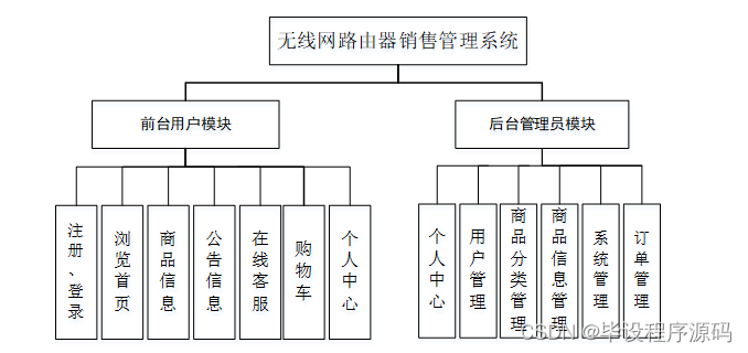 无线网路由器销售管理系统按照权限的类型进行划分,分为用户和管理员两个模块。用户模块主要实现个人信息修改、对商品信息、公告信息、留言板、购物车、订单等信息进行操作,增强了用户的操作体验。管理员模块主要针对整个系统的管理进行设计,提高了管理的效率和标准。系统的总体模块设计如下图所示: