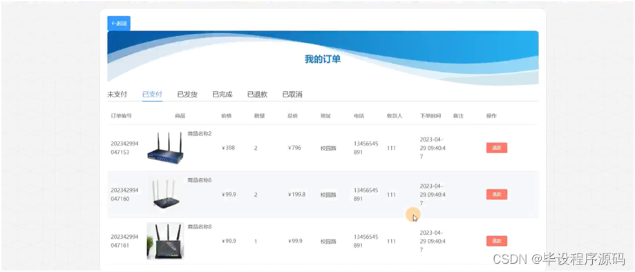 管理员点击订单管理,进入订单管理页面,可以对已支付订单、已完成订单,已退款订单、已发货订单等订单进行管理;在已支付订单页面,管理员可以通过输入订单编号和商品名称进行查询的操作,还可以进行在线发货的操作。具体操作页面如图5-13所示: