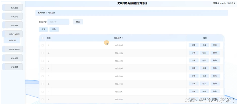 管理员点击商品分类管理,进入商品分类管理页面,可以通过输入商品分类进行查询的操作,还可以对商品分类信息进行新增、修改或删除等操作。具体操作页面如图5-10所示: