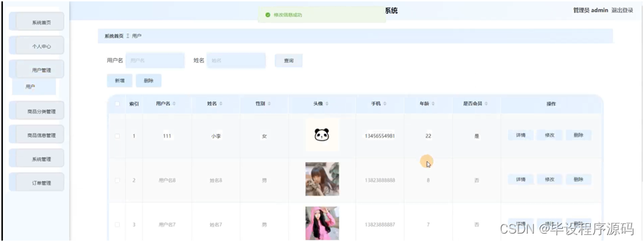 管理员点击用户管理,进入用户管理页面,可以通过输入用户名、姓名可以进行查询的操作,还能对用户信息进行新增、修改或删除等操作。具体操作页面如图5-9所示: