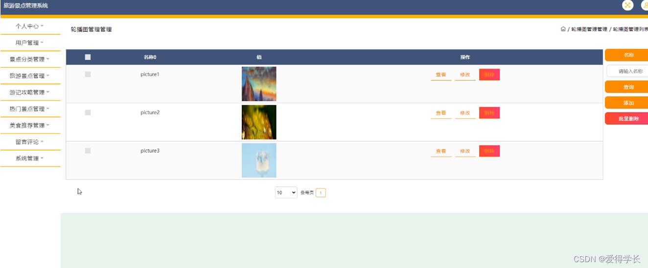 旅游景点管理,管理员在旅游景点管理页面可以查看景点名称、景点分类、景点图片、推荐指数、景点等级、景点地址、门票价格、开放时间、服务电话、注意事项、交通指南等信息,并可根据需要对旅游景点管理进行查看、修改、删除等操作,如图5-6所示。