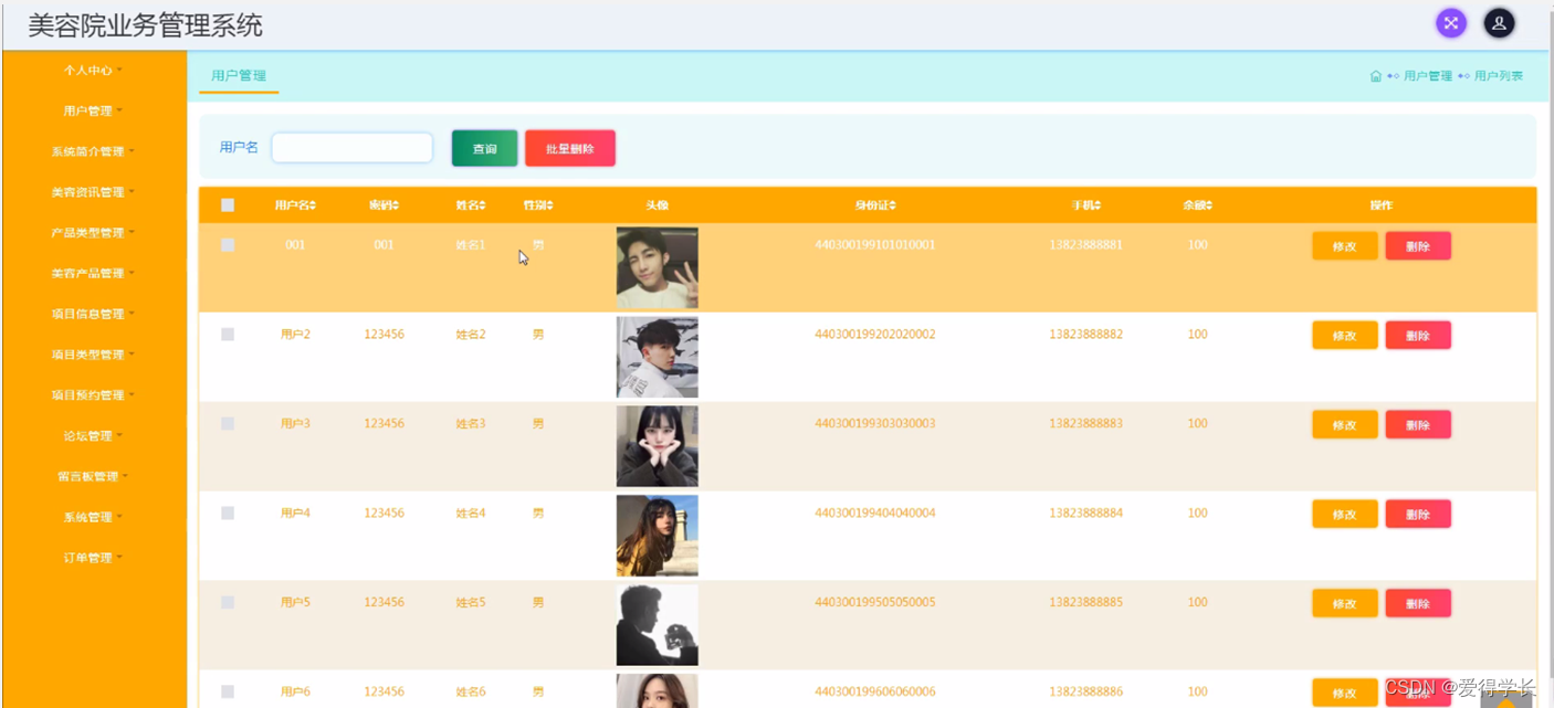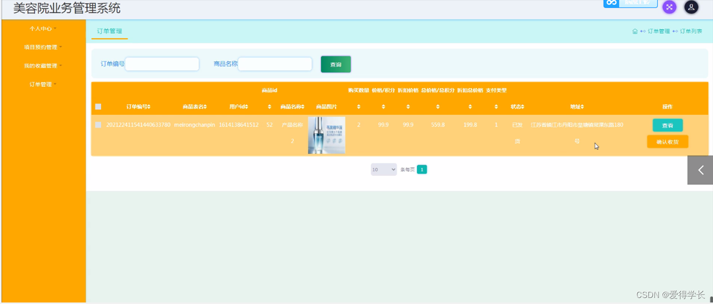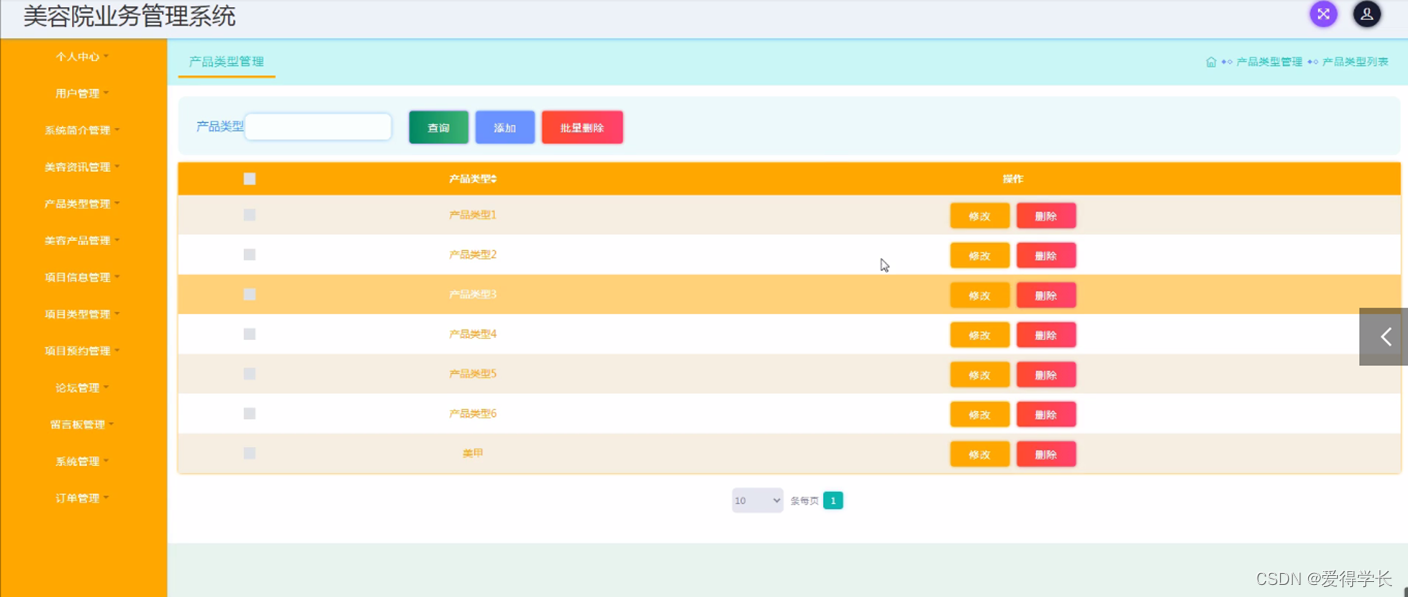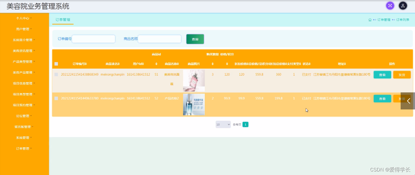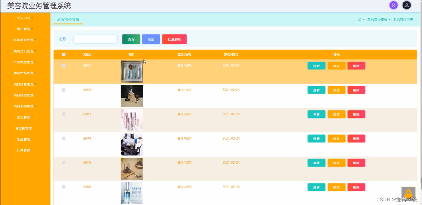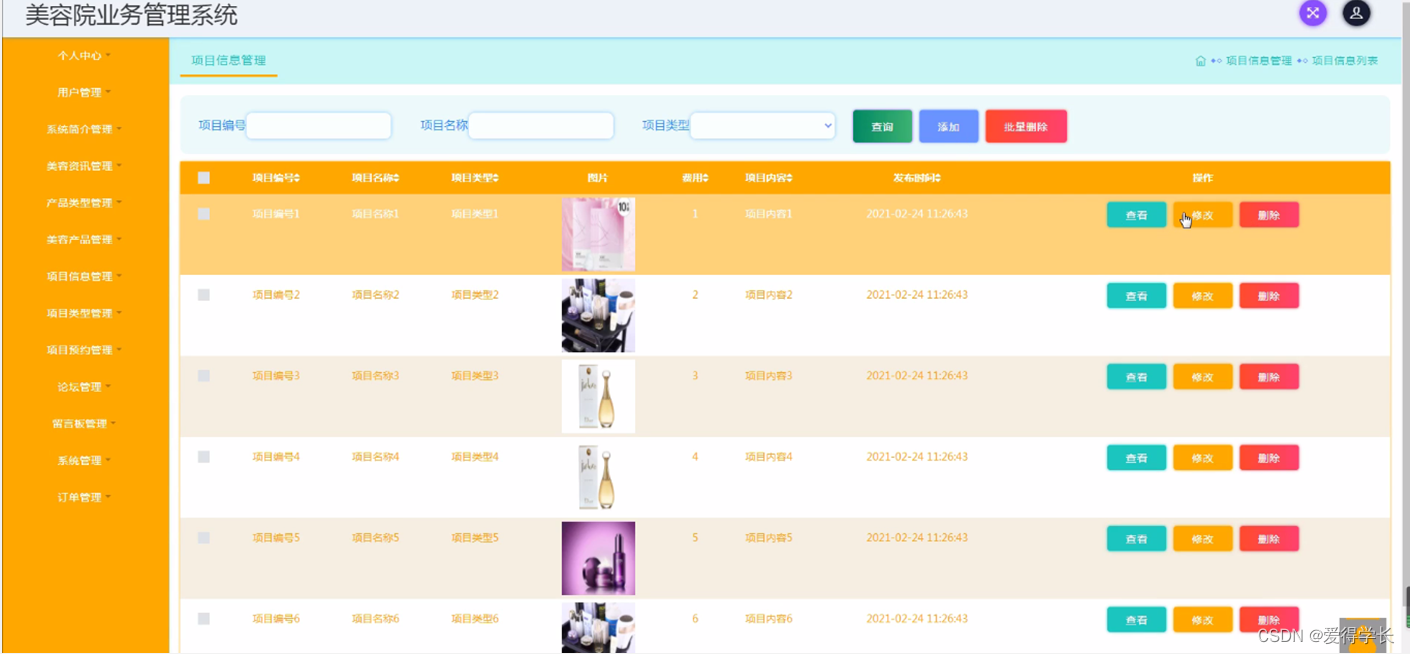 设计开发了具有管理员;个人中心、用户管理、系统简介管理、美容资讯管理、产品类型管理、美容产品管理、项目信息管理、项目类型管理、项目预约管理、论坛管理、留言板管理、系统管理、订单管理,用户;个人中心、项目预约管理、我的收藏管理、订单管理,前台首页;首页、美容产品、项目信息、论坛信息、留言反馈、我的、跳转到后台、购物车等功能的美容院业务管理系统。