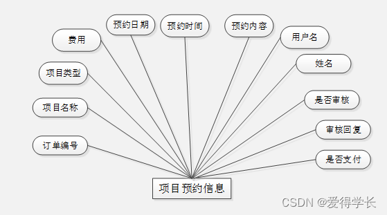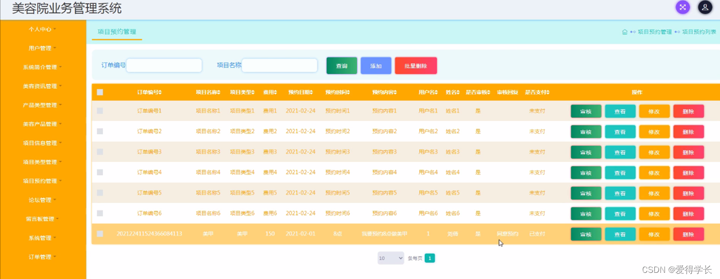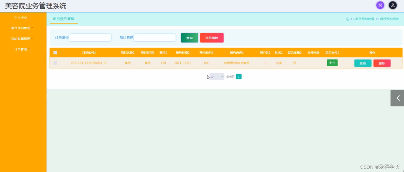 项目预约管理,在项目预约管理页面可以填写订单编号、项目名称、项目类型、费用、预约日期、预约时间、预约内容、用户名、姓名、是否审核、审核回复、是否支付等详细内容,进行详情、查看,如图4-1所示。