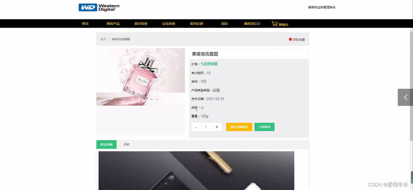 美容产品,在美容产品页面中通过填写价格、单次购买、库存、产品类型、发布日期、规格、重量等信息进行添加到购物车、立即购买,如图4-12所示。