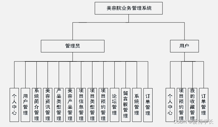 这些功能可以充分满足美容院业务管理系统的需求。此系统功能较为全面如下图系统功能结构如图3-3所示。
