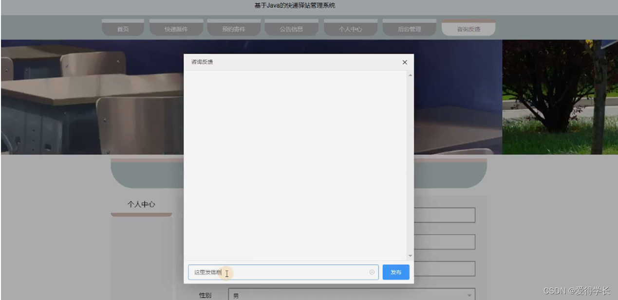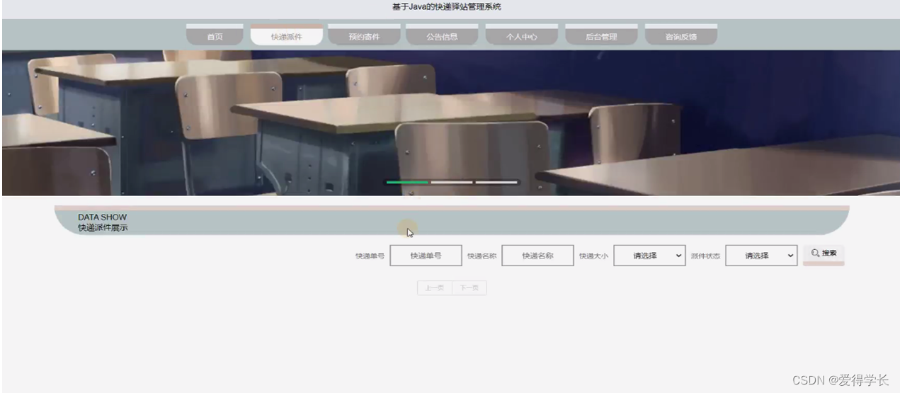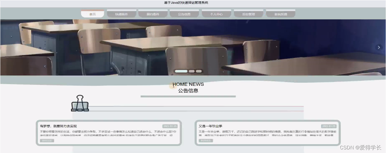 用户登录到快递驿站管理系统,在网站首页可以查看首页、快递派件、预约寄件、公告消息、个人中心、后台管理、咨询反馈等内容,并进行相应操作,如图5-2所示。