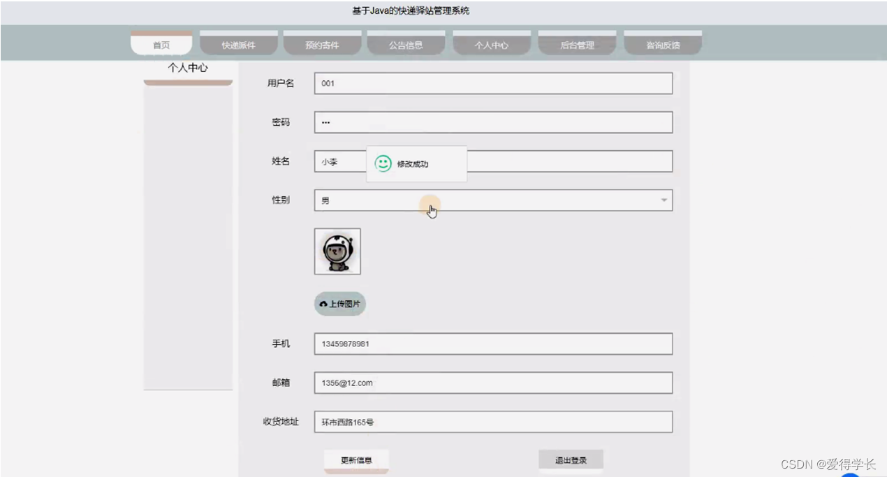点击后台管理,页面跳转到系统后台,用户可以对个人中心、取件记录管理、预约寄件管理、寄件记录管理等功能进行相应操作,后台管理页面如图5-7所示。