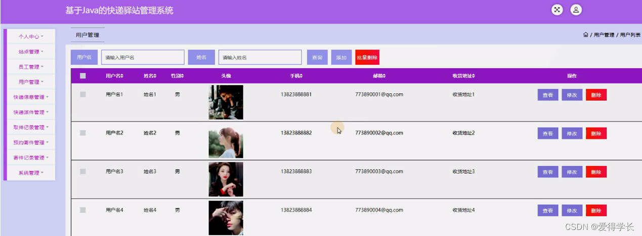 在用户管理页面,可以对用户名、姓名、性别、头像、手机、邮箱、收货地址等内容进行查看、修改、删除、添加或批量删除等操作,如图5-11所示。