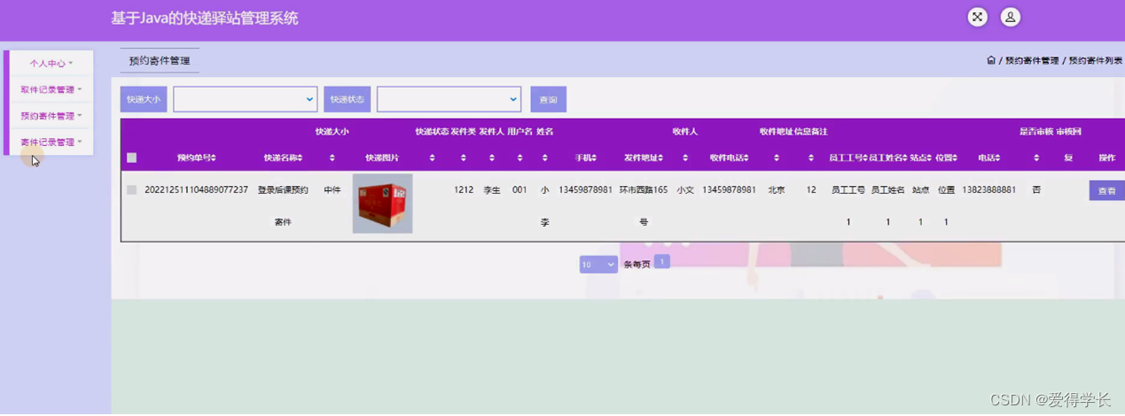 在预约寄件管理页面,用户可以对预约单号、快递名称、快递大小、快递图片、快递状态、发件类、发件人、用户名、姓名、手机、发件地址、收件人、收件电话、收件地址、信息备注、员工工号、员工姓名、站点、位置、电话、是否审核、审核回复等进行查看,预约寄件管理如图5-8所示。