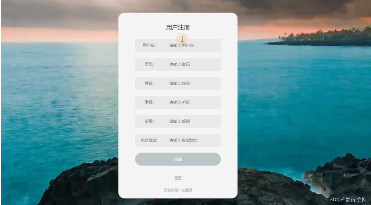 用户注册,在用户注册页面通过填写用户名、密码、姓名、手机、邮箱、收货地址等信息完成用户注册操作,如图5-1-1所示;注册好后,用户需要输入账号、密码进行登录,如图5-1-2所示。