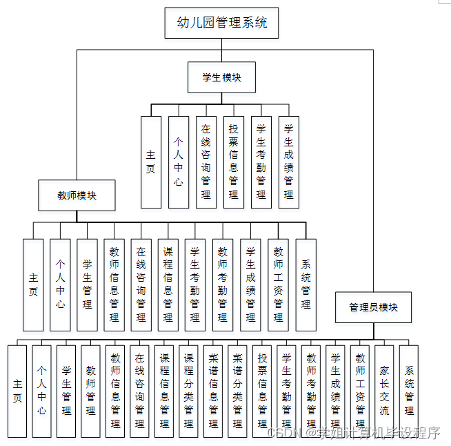系统功能结构图是系统设计阶段,系统功能结构图只是这个阶段一个基础,整个系统的架构决定了系统的整体模式,是系统的根据。幼儿园管理系统的整个设计结构如图3-1所示。