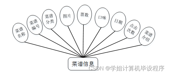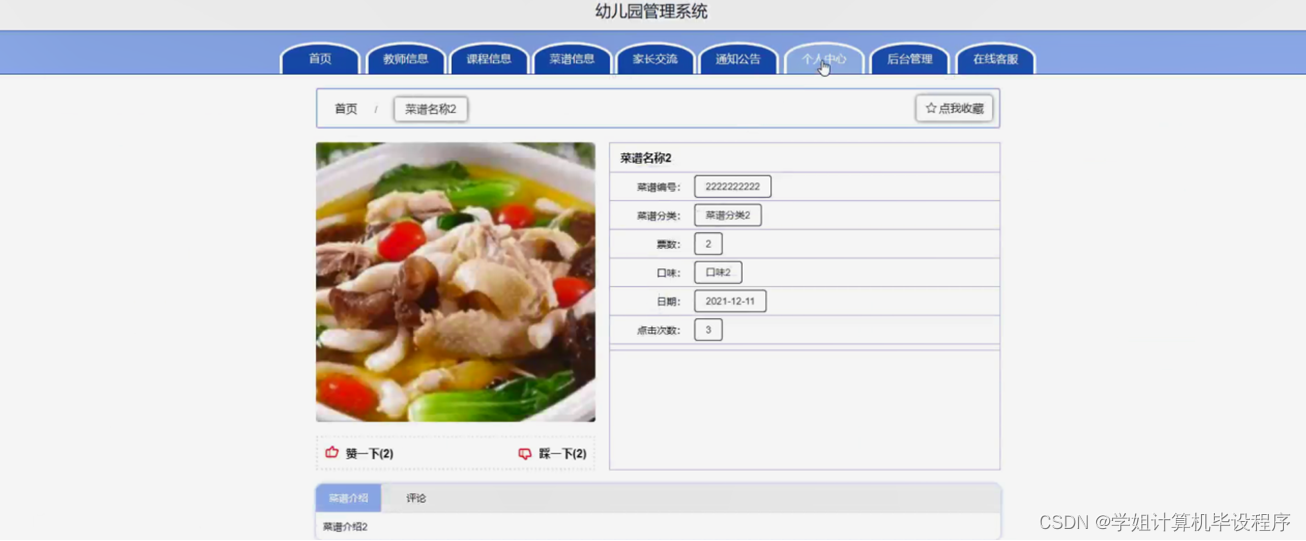 菜谱信息,在菜谱信息页面可以查看菜谱名称、菜谱编号、菜谱分类、图片、票数、口味、日期、点击次数、菜谱介绍等详细内容,并进行评论或收藏等操作,如图5-4所示。