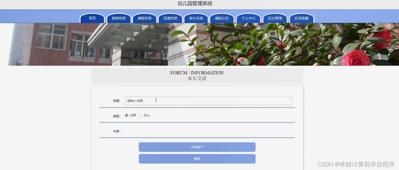家长交流,在家长交流页面通过填写标题、类型、内容等详细内容进行发布帖子或重置等操作;如图5-5所示。