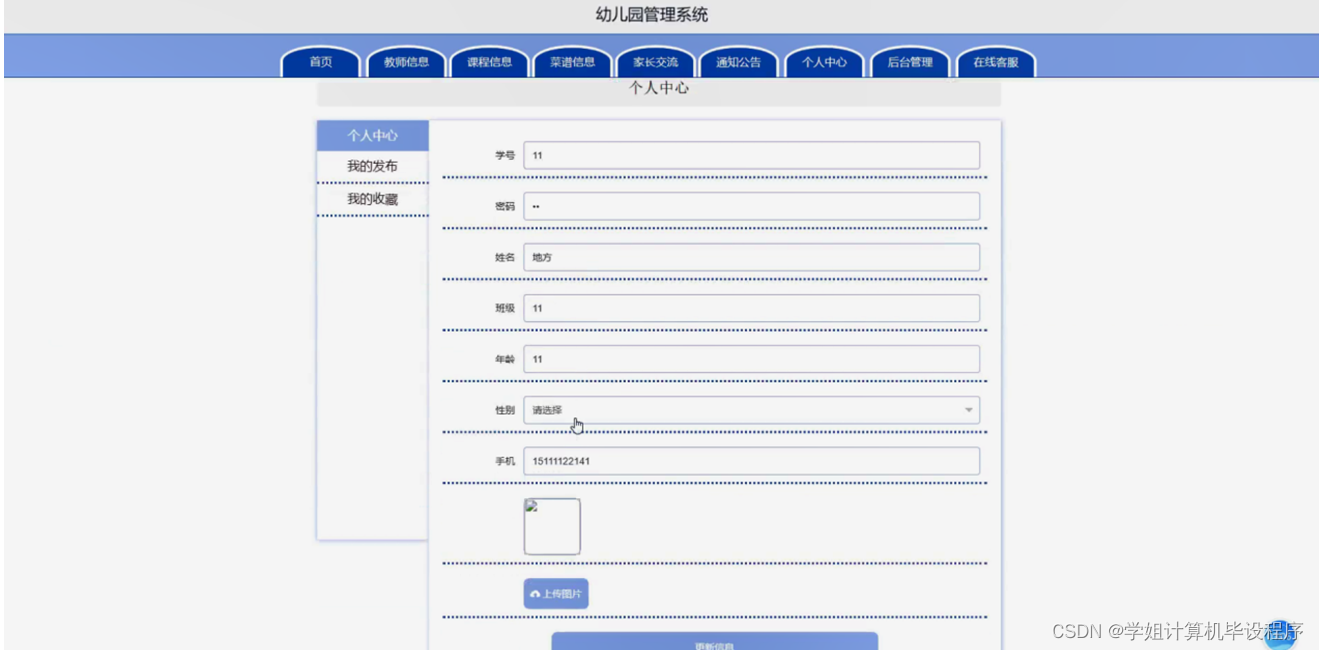 个人中心,在个人中心页面通过填写学号、密码、姓名、班级、年龄、性别、手机、上传图片等信息进行更新信息,根据需要对我的发布,我的收藏进行相对应操作,如图5-6所示。