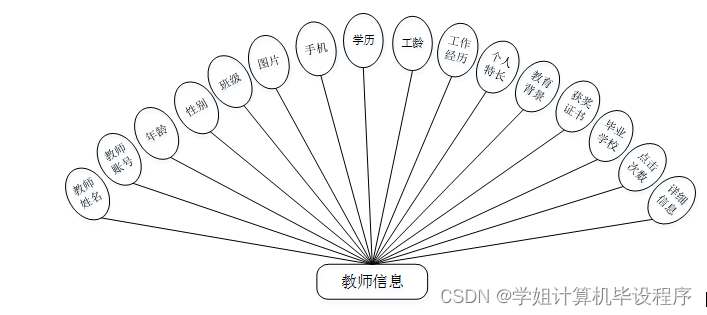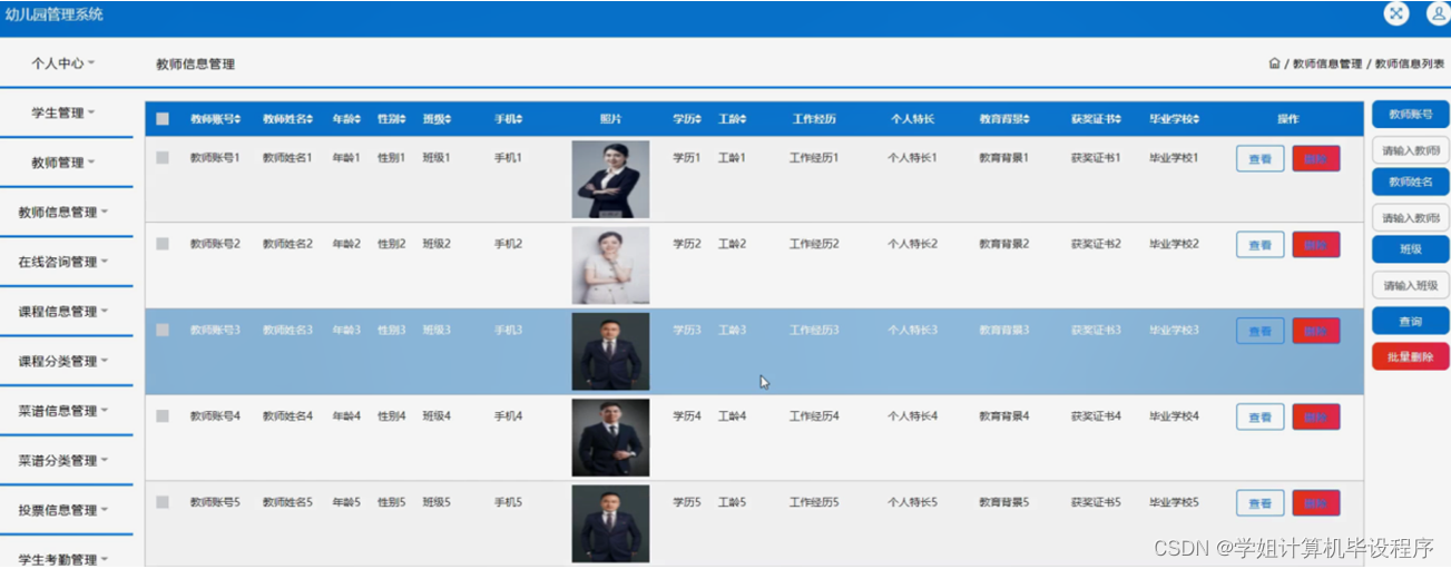 教师信息管理,在教师信息管理页面可以对教师账号、教师姓名、年龄、性别、班级、手机、照片、学历、工龄、工作经历、个人特长、教育背景、获奖证书、毕业学校等内容进行查看或删除等操作,如图5-11所示。