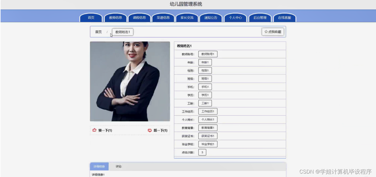 教师信息,在教师信息页面可以查看教师姓名、教师账号、年龄、性别、班级、图片、手机、学历、工龄、工作经历、个人特长、教育背景、获奖证书、毕业学校、点击次数、详细信息等详细内容,并进行评论或收藏等操作,如图5-2所示。