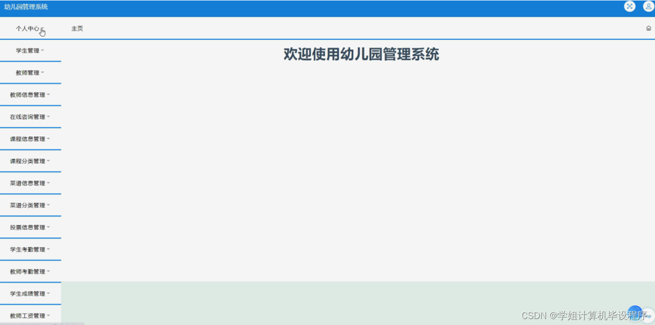 管理员登录系统后,可以对主页、个人中心、学生管理、教师管理、教师信息管理、在线咨询管理、课程信息管理、课程分类管理、菜谱信息管理、菜谱分类管理、投票信息管理、学生考勤管理、教师考勤管理、学生成绩管理、教师工资管理、家长交流、系统管理等功能模块进行相应操作,如图5-8所示。