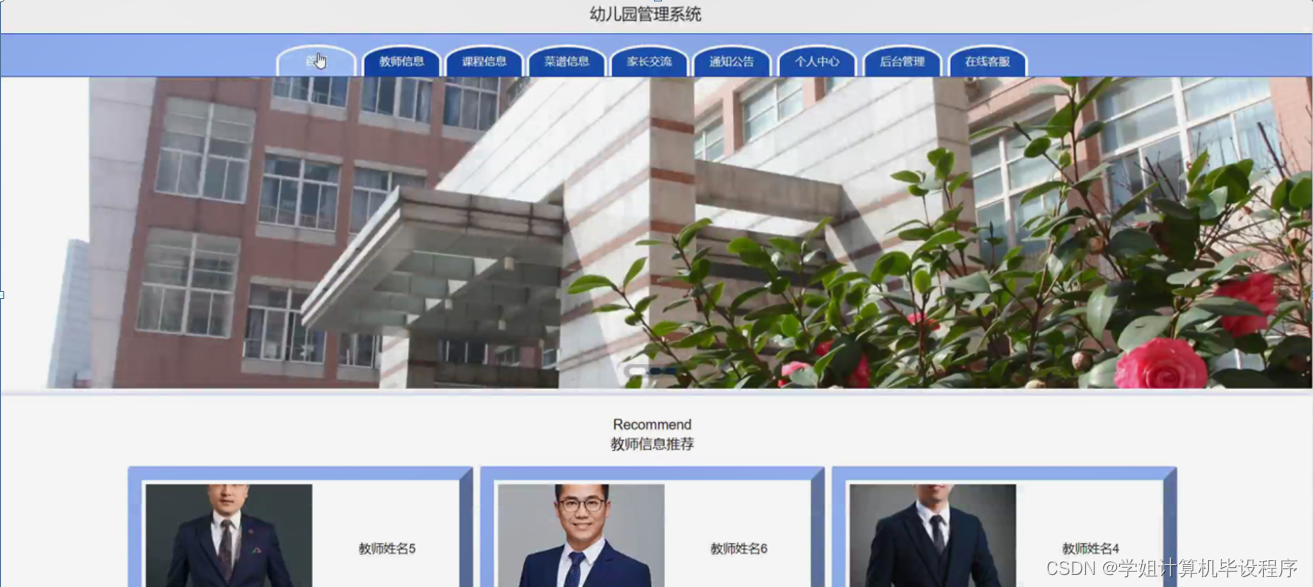 幼儿园管理系统,在系统首页可以查看首页、教师信息、课程信息、菜谱信息、家长交流、通知公告、个人中心、后台管理、在线客服等内容进行详细操作,如图5-1所示。