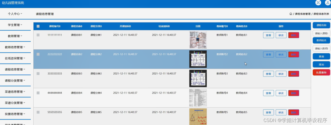 课程信息管理,在课程信息管理页面可以对课程编号、课程名称、课程分类、开课时间、结束时间、封面、教师账号、教师姓名等内容进行查看、修改或删除等操作,如图5-12所示。