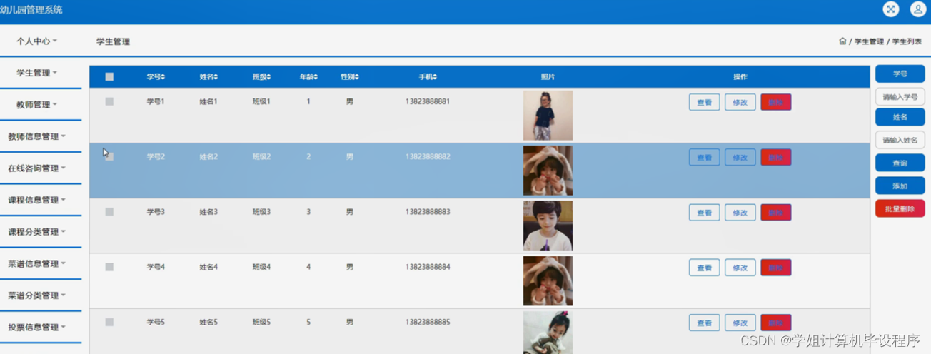 学生管理,在学生管理页面可以对学号、姓名、班级、年龄、性别、手机、照片等信息进行查看、修改或删除等操作,如图5-9所示。