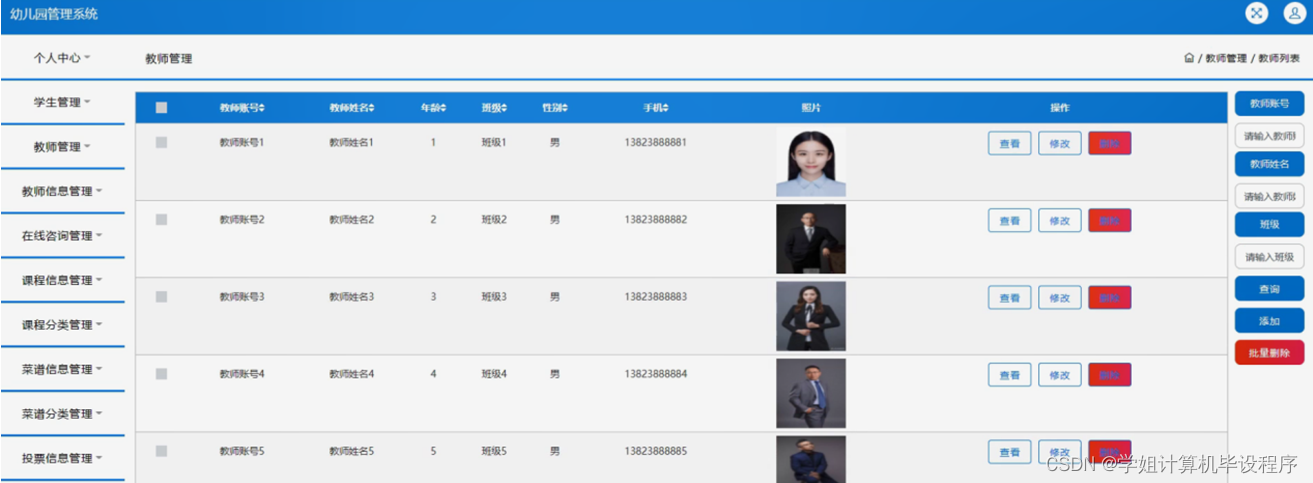 教师管理,在教师管理页面可以对教师账号、教师姓名、年龄、班级、性别、手机、照片等信息进行查看、修改或删除等操作,如图5-10所示。