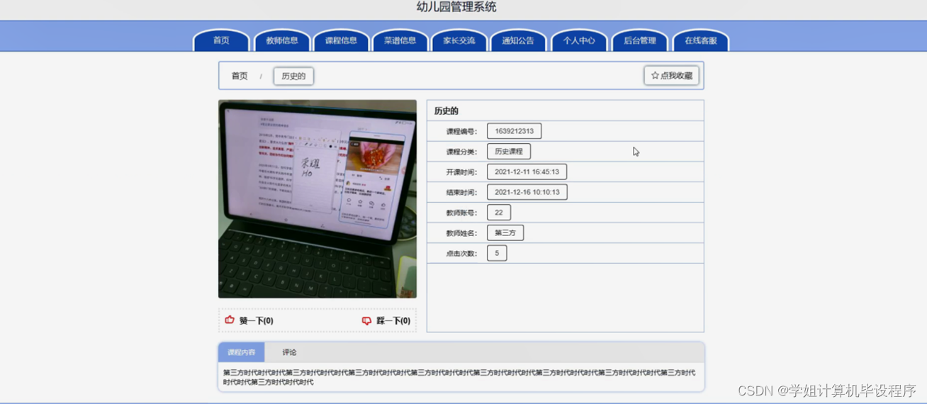 课程信息,在课程信息页面可以查看课程名称、课程编号、课程分类、开课时间、结束时间、封面、教师账号、教师姓名、点击次数、课程内容等详细内容,并进行评论或收藏等操作,如图5-3所示。