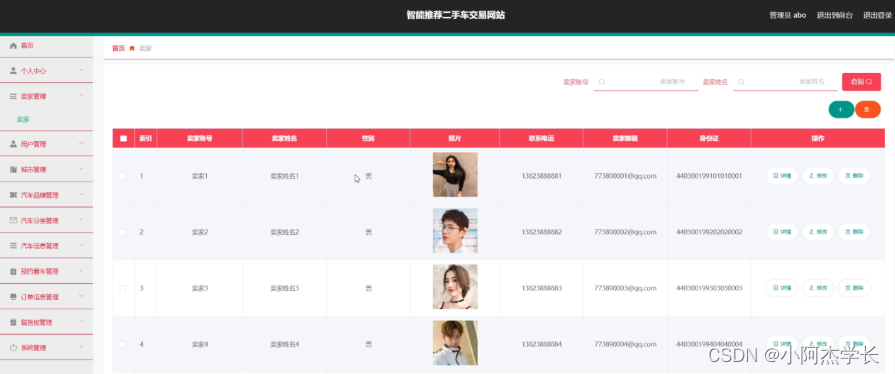 卖家管理,在卖家管理页面中可以对索引、卖家账号、卖家姓名、性别、照片、联系电话、卖家邮箱、身份证等信息进行详情,修改或删除等操作,如图5-6所示。
