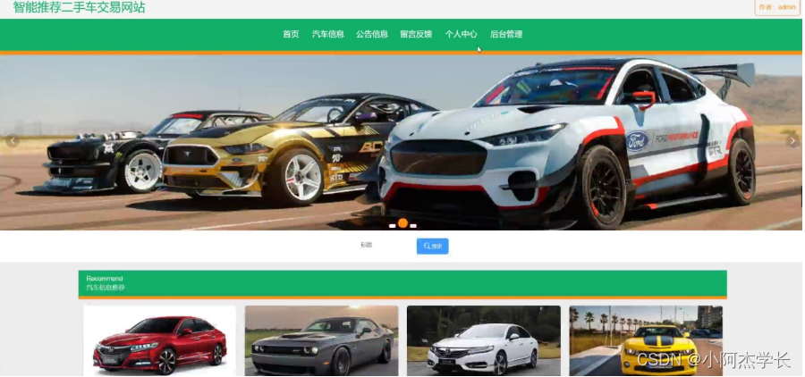 智能推荐二手车交易网站,在系统的首页可以查看首页、汽车信息、公告信息、留言反馈、个人中心、后台管理等信息进行详细操作,如图5-1所示。