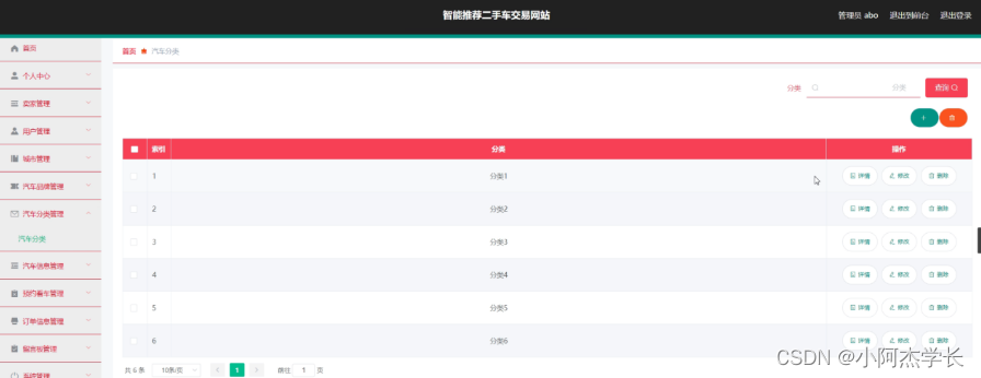 汽车分类管理,在汽车分类管理页面中可以对索引、分类等信息进行详情、修改或删除等操作,如图5-9所示。