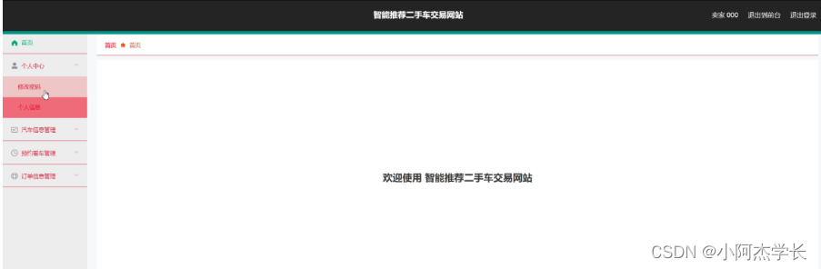卖家登录进入系统可以查看首页、个人中心、汽车信息管理、预约看车管理、订单信息管理等信息,并进行相应的操作管理,如图5-17所示。