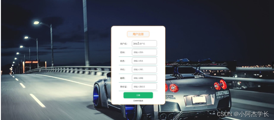 用户注册,在用户注册页面通过填写用户名、密码、姓名、手机、邮箱、身份证等信息完成用户注册,如图5-3所示。