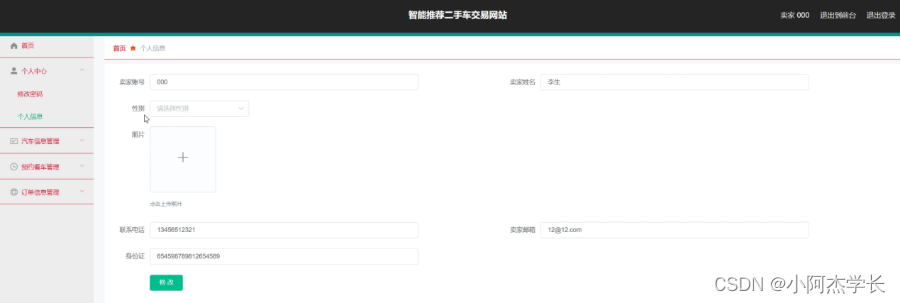 个人中心,在个人中心页面通过填写卖家账号、卖家姓名、性别、照片、联系电话、卖家邮箱、身份证等信息进行个人信息修改操作,如图5-18所示。