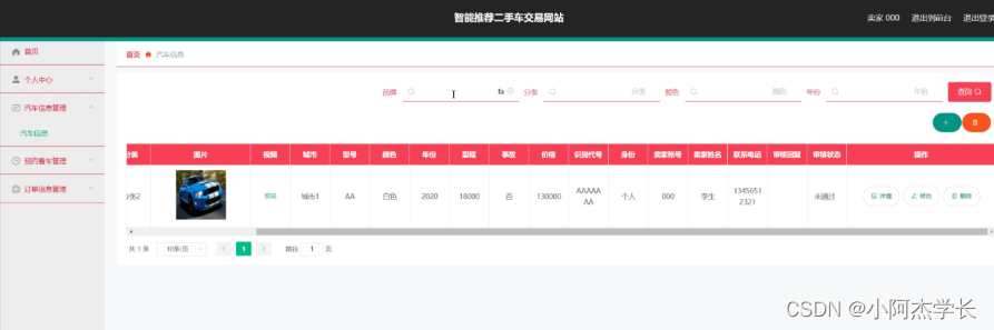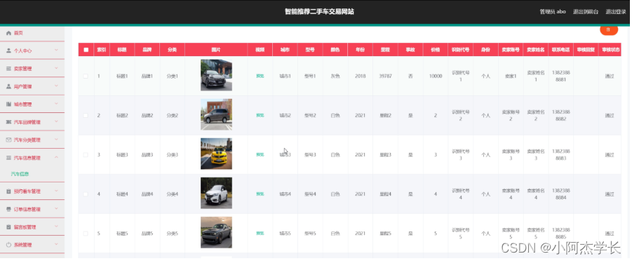 汽车信息管理,在汽车信息管理页面中可以对索引、标题、品牌、分类、图片、视频、城市、型号、颜色、年份、里程、事故、价格、识别代号、身份、卖家账号、卖家姓名、联系电话、审核回复、审核状态等信息进行详情、修改或删除等操作,如图5-19所示。