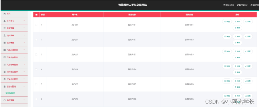留言板管理,在留言板管理页面中可以对索引、用户名、留言内容、回复内容等信息进行详情、修改、回复或删除等操作,如图5-13所示。