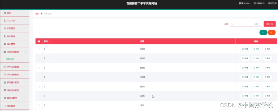 汽车品牌管理,在汽车品牌管理页面中可以对索引、品牌等信息进行详情,修改或删除等操作,如图5-8所示。