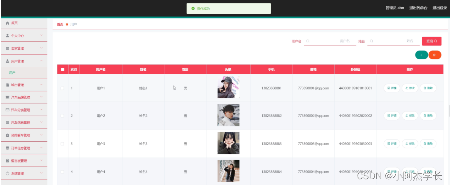用户管理,在用户管理页面中可以对索引、用户名、姓名、性别、头像、手机、邮箱、身份证等信息进行详情,修改或删除等操作,如图5-7所示。