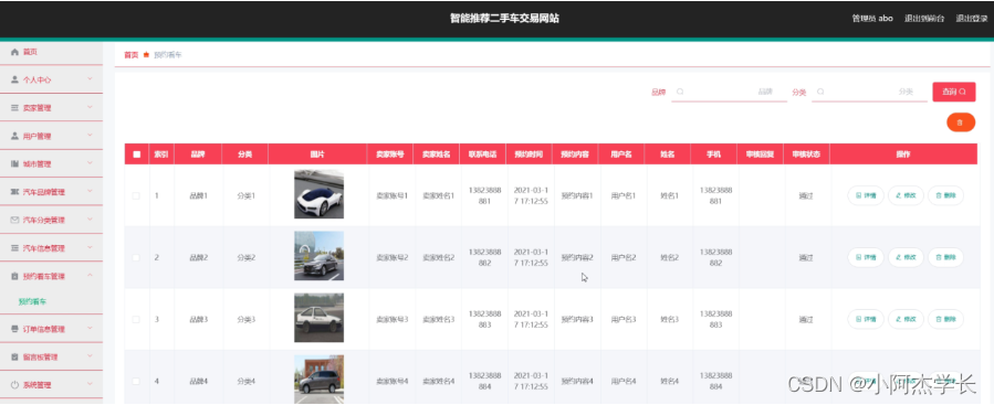 预约看车管理,在预约看车管理页面中可以对索引、品牌、分类、图片、卖家账号、卖家姓名、联系电话、预约时间、预约内容、用户名、姓名、手机、审核回复、审核状态等信息进行详情,修改或删除等操作,如图5-11所示。