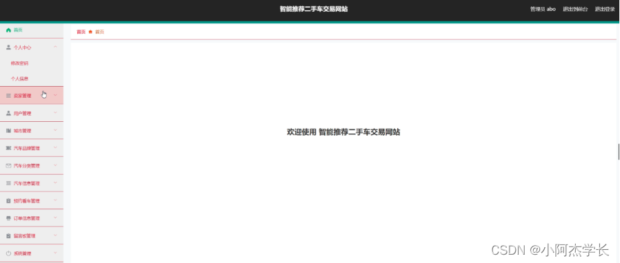 管理员登录进入系统之后,就可以对所有的信息进行查看,可以查看到首页、个人中心、卖家管理、用户管理、城市管理、汽车品牌管理、汽车分类管理、汽车信息管理、预约看车管理、订单信息管理、留言板管理、系统管理等,并且还可以对其进行相应的操作管理,如图5-5所示。