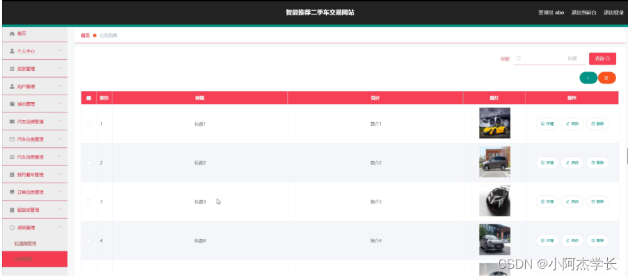 系统管理,在公告信息页面中可以对索引、标题、简介、图片等信息进行详情、修改或删除等操作,还可以根据需要对轮播图管理进行详细操作;如图5-14所示。