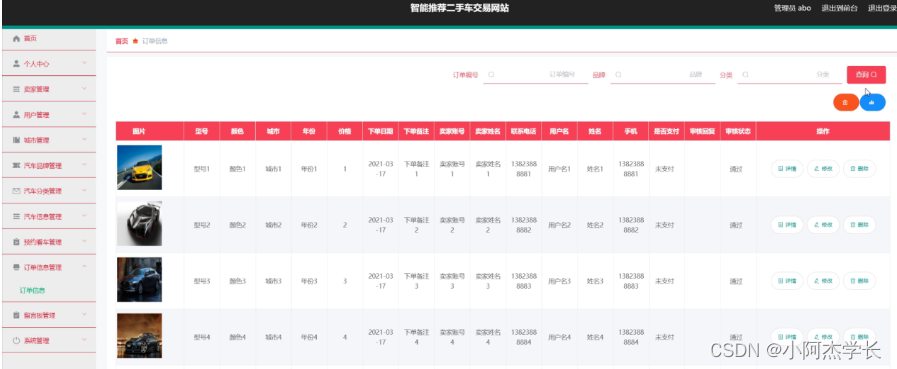 订单信息管理,在订单信息管理页面中可以对索引、订单编号、品牌、分类、图片、型号、颜色、城市、年份、价格、下单日期、下单备注、卖家账号、卖家姓名、联系电话、用户名、姓名、手机、是否支付、审核回复、审核状态等信息进行详情,修改或删除等操作,如图5-12所示。