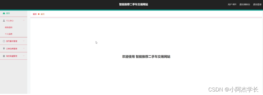 用户登录进入系统后台可以查看首页、个人中心、预约看车管理、订单信息管理、我的收藏管理等信息,并进行相应的操作管理,如图5-15所示。