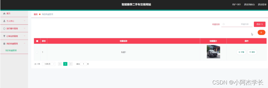 我的收藏管理,在我的收藏管理页面中可以对索引、收藏名称、收藏图片等信息进行详情或删除等操作,如图5-16所示。