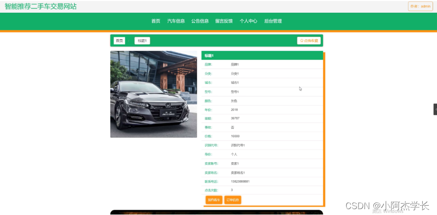 汽车信息,在汽车信息页面中可以查看标题、品牌、分类、图片、城市、型号、颜色、年份、里程、事故、价格、识别代号、身份、卖家账号、卖家姓名、联系电话、详情等信息,并进行预约看车、订单信息、评论或收藏等操作;如图5-2所示。