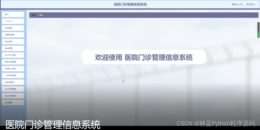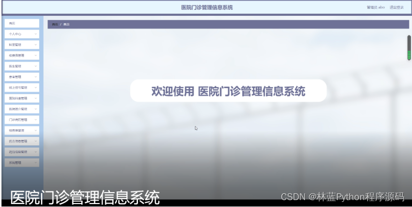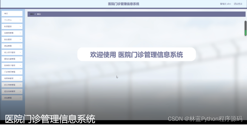 管理员登录进入医院门诊管理信息系统可以查看首页,个人中心,科室管理,收费员管理,医生管理,患者管理,线上挂号管理,医院科室管理,医院简介管理,门诊病历管理,检查单管理,药方信息管理,药品信息管理,系统管理等内容进行详细操作,如图5-8所示。