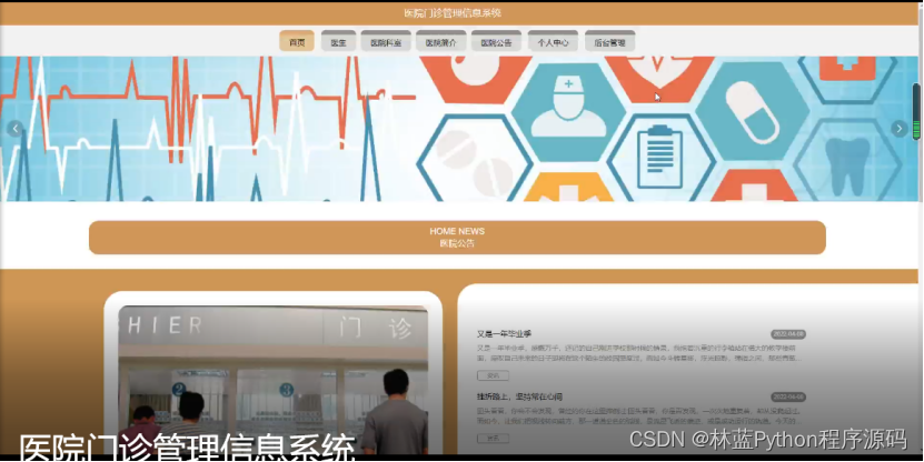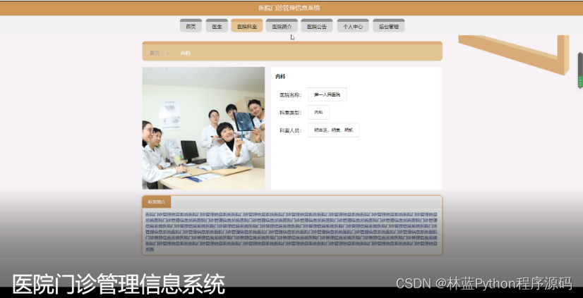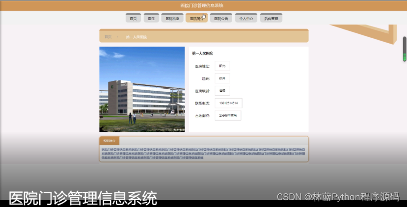 登录进入医院门诊管理信息系统可以查看首页,医生,医院科室,医院简介,医院公告,个人中心,后台管理等内容进行详细操作,如图5-3所示。